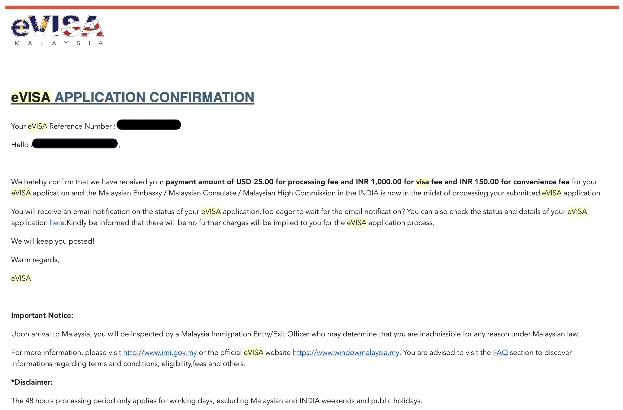 - Request Document / Data Amendment – Your eVISA application requires additional information.